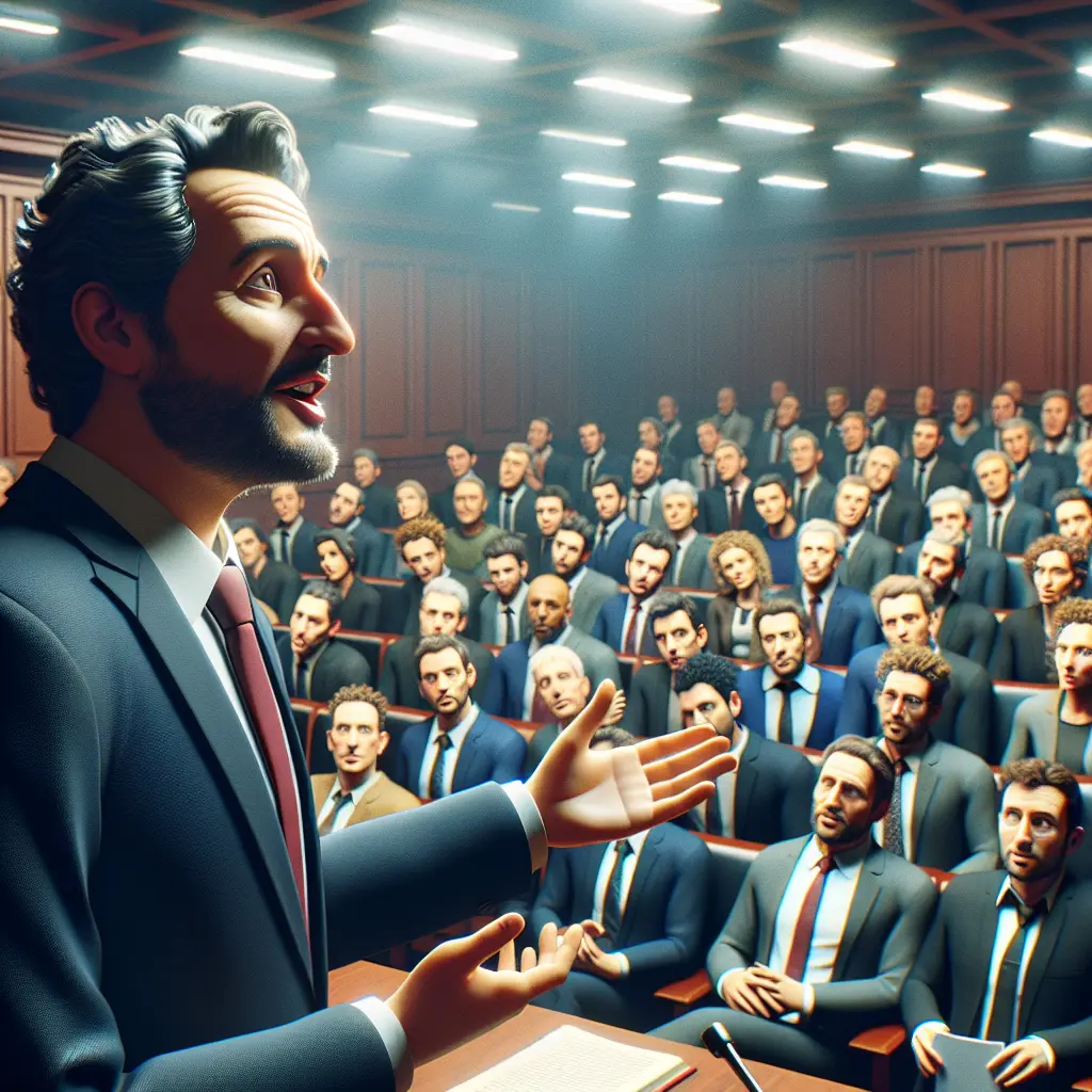 A speaker, reminiscent of Christopher Hitchens, delivers a powerful address on the political implications of Islam to a captivated audience.